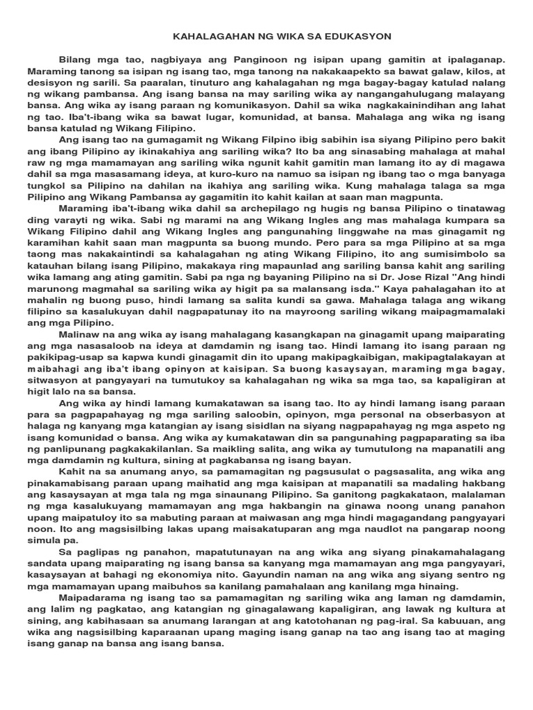 Ito ang mga tanyag na katagang nagmula sa ating pambansang bayani na si Gat. Kahalagahan ng Wika sa Globalisasyon bilang wikang opisyal Ang wika ay isang instrumento na namamagitan sa mga tao may kakayahan ito maging susi sa integrasyon ng isang lipunan. Kahalagahan Ng Wika - Pinoy Newbie.