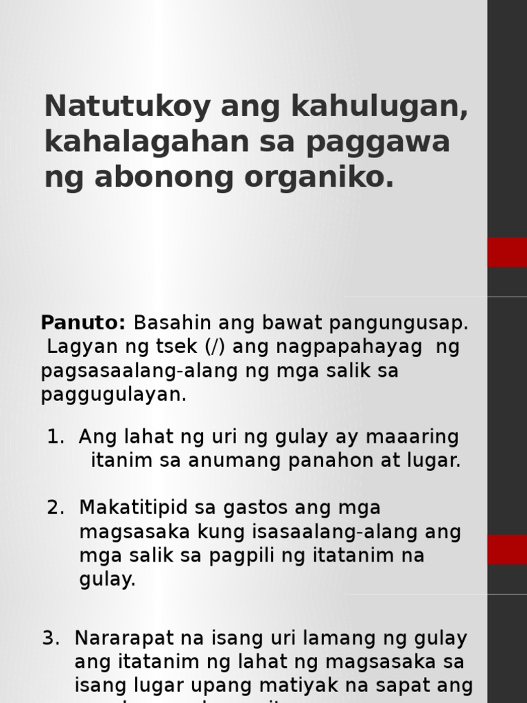 Isulat ang kung ang mga sumusunod ay kahalagahan ng paggawa ng abonong organiko at kung hindi ____1. Ano ang pinakamahalagang sangkap ng pagtatanim. Isulat angkung ang mga sumusunod ay kahalagahan ng paggawa ng abonong organiko at kung hindi _____1.